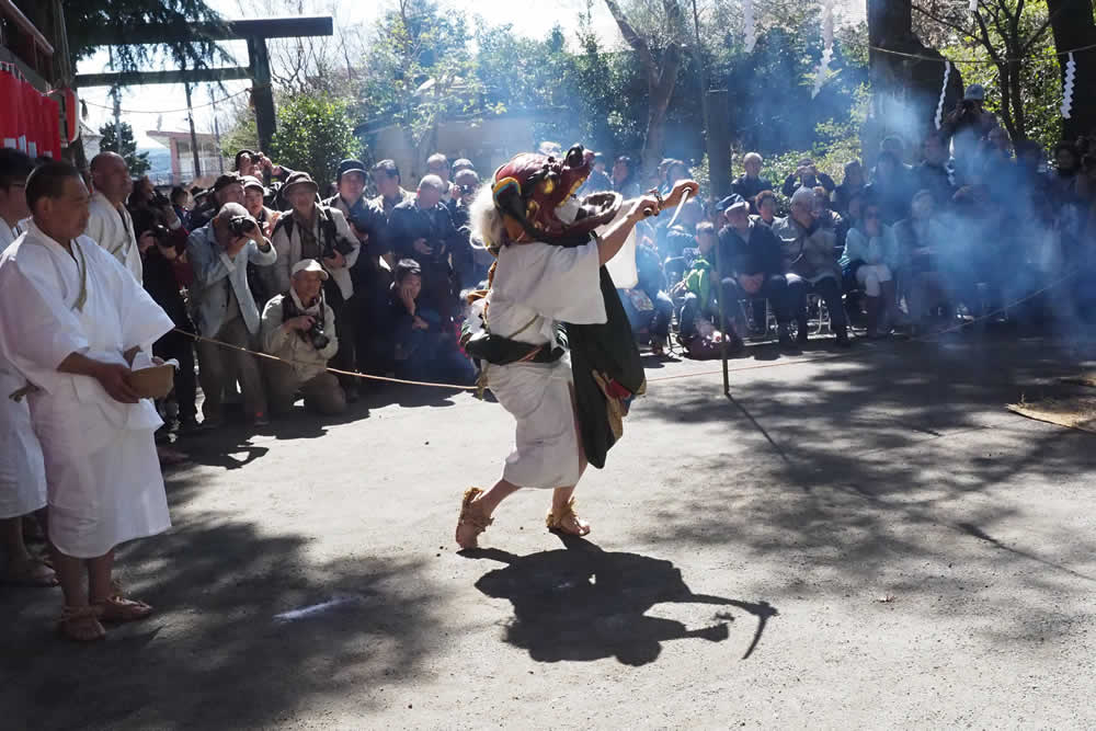 剣の舞が終るといよいよ湯立の行事に入ることとなるが、ここで神楽は一時中止となり、「禊(みそぎ)」の行に移る。